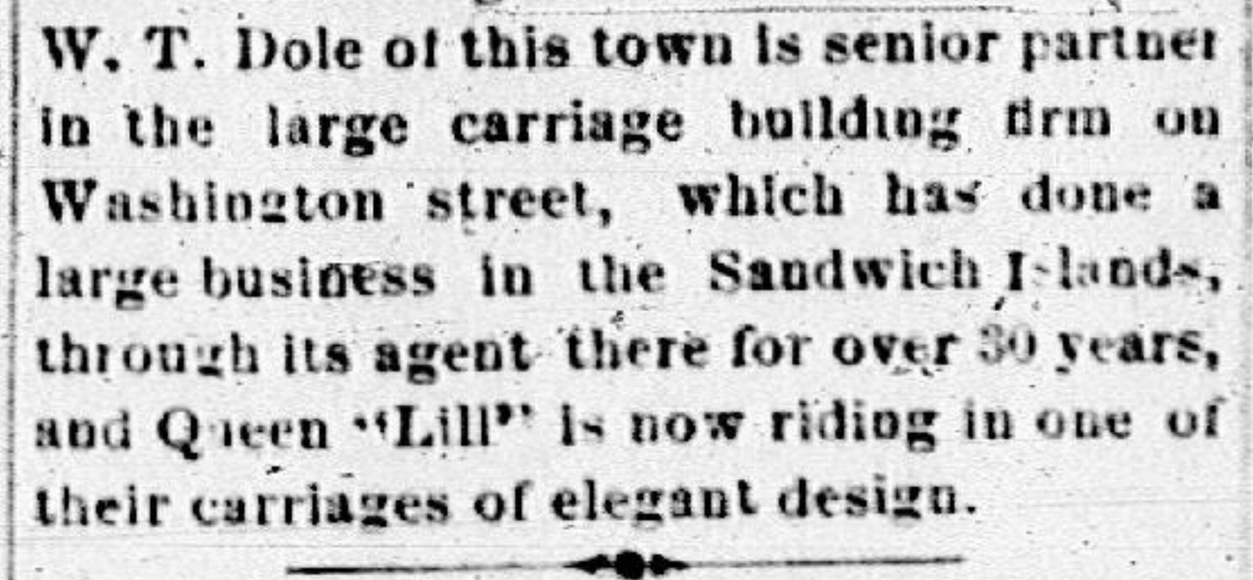 Most famous among Dole & Osgood’s carriages was a personal luxury carriage produced for the Queen of Hawai’i, Liliʻuokalani. As this newspaper article stated, the carriage company had a number of “agents” in Hawai’i facilitating trade.