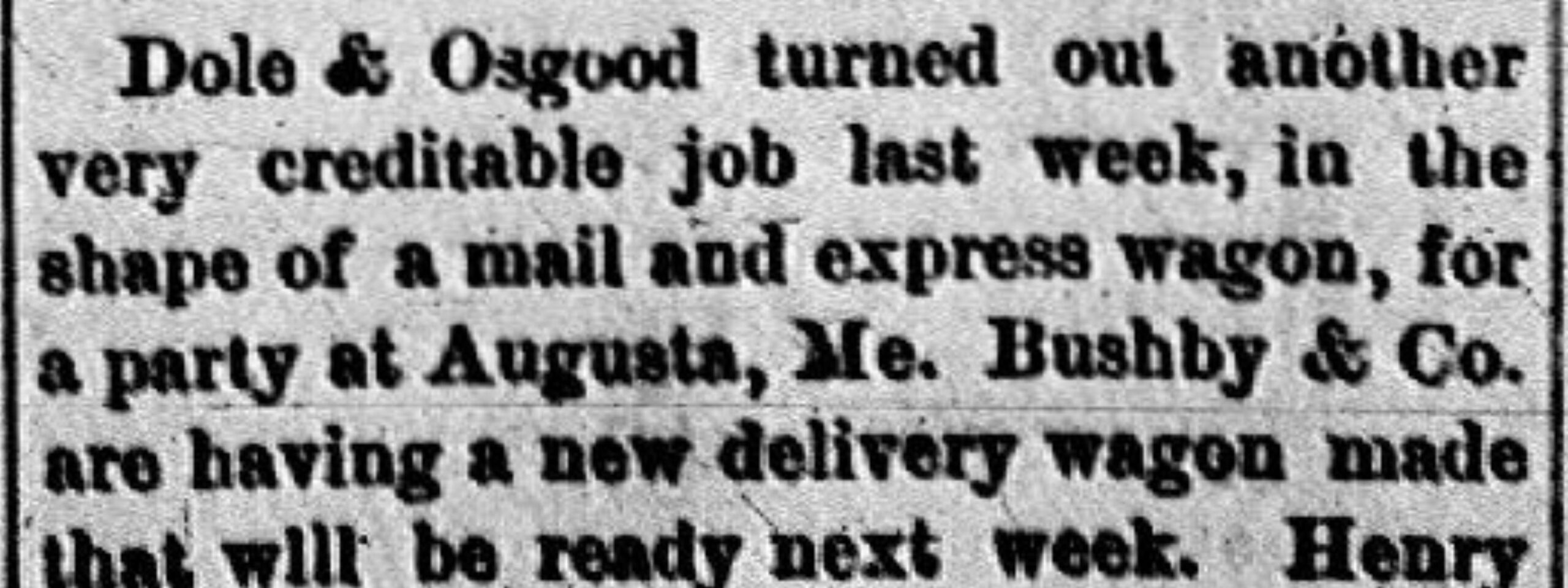 Dole & Osgood were widely known for producing carriages for commercial and municipal use. Among the uses of their carriages, Peabody’s fire department ordered a new hose carriage, and “the tires of the wheels of Steamer 1” from Dole & Osgood (Peabody Press, 11 December 1872, page 2).